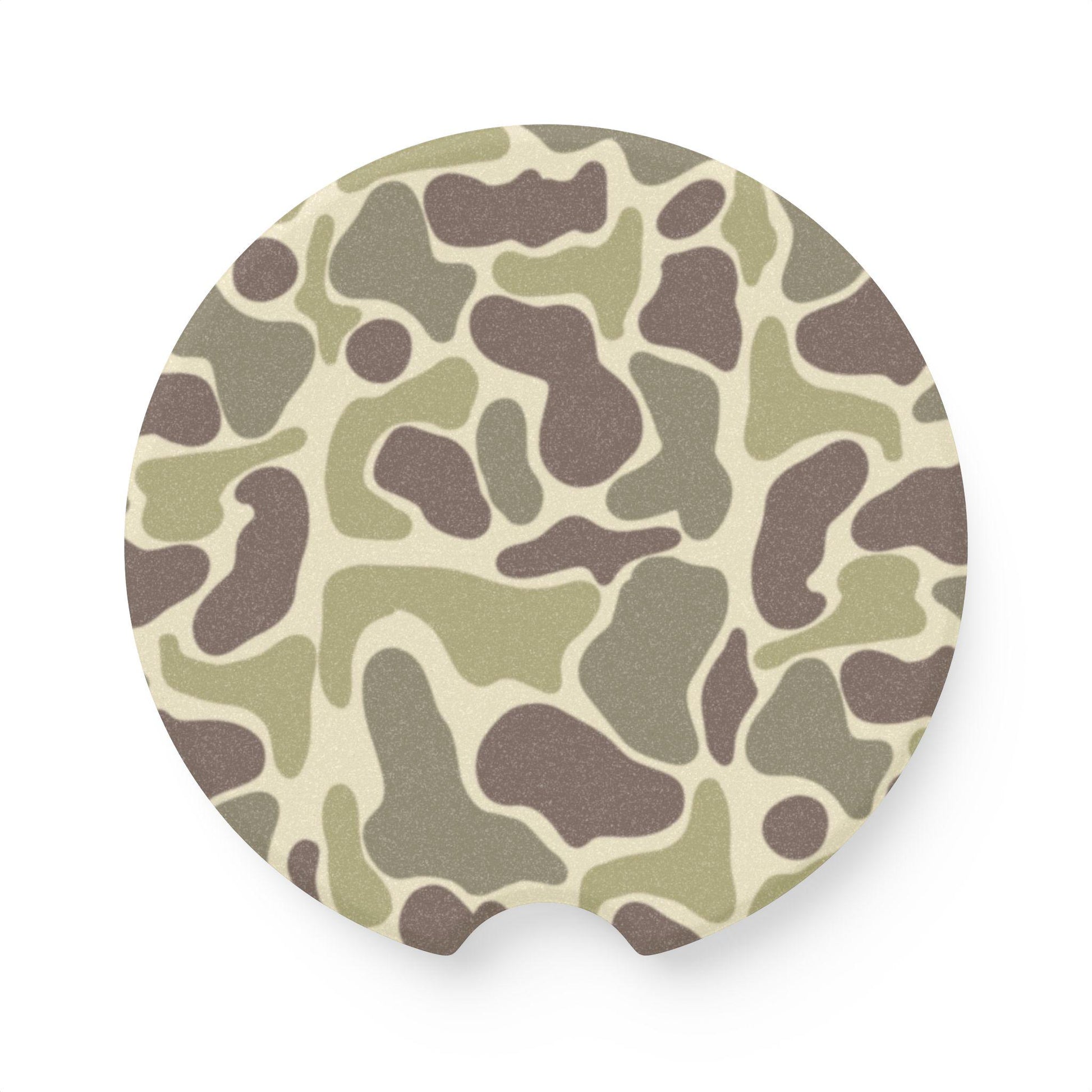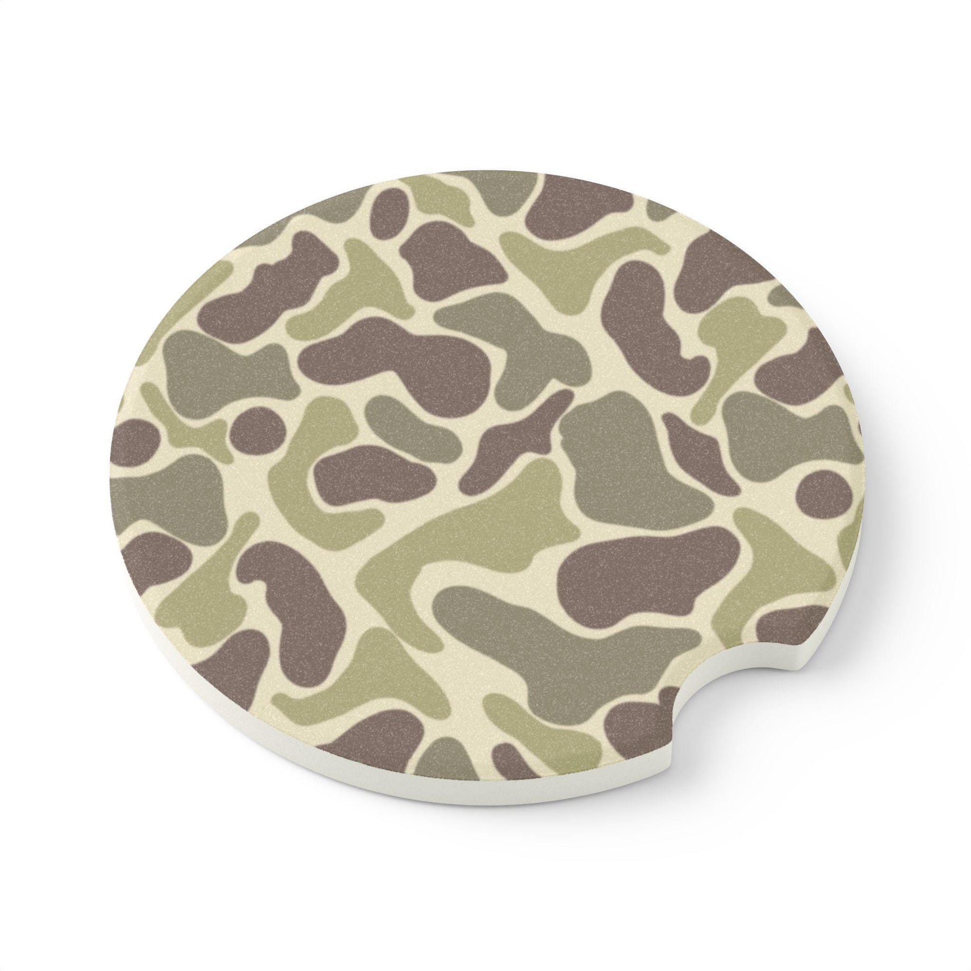 Duck Camo Pattern Coasters made of soapstone with a matte finish that absorbs condensation. Perfect for car cup holders, keeping them clean and dry. Ideal for car enthusiasts and outdoor lovers. Great for gifting during holidays, birthdays, or as a practical everyday item.