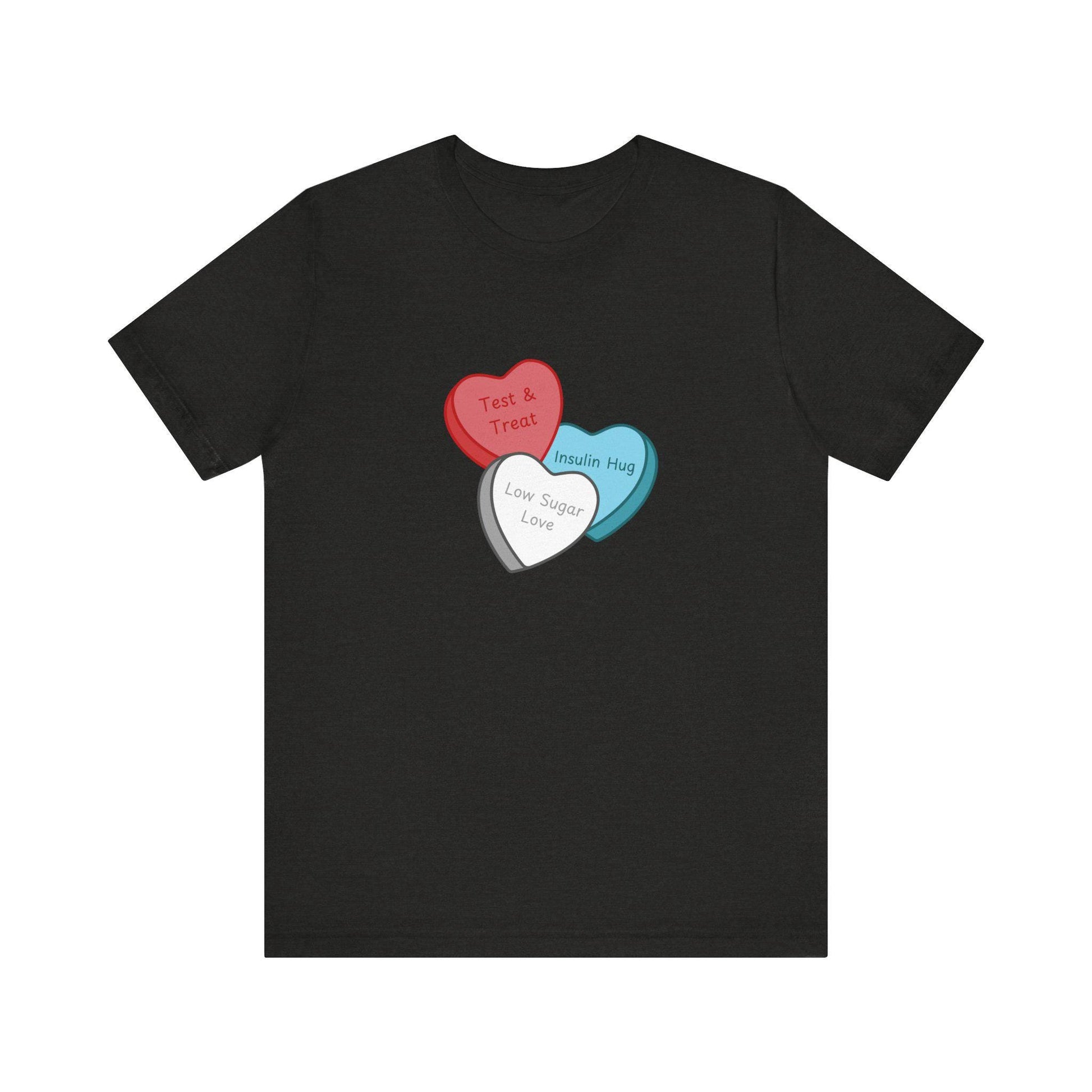 Conversation Hearts Diabetes Tee - 'Test & Treat, Insulin Hug, Low Sugar Love' - Perfect for Diabetics, Health Advocates, Gifts,