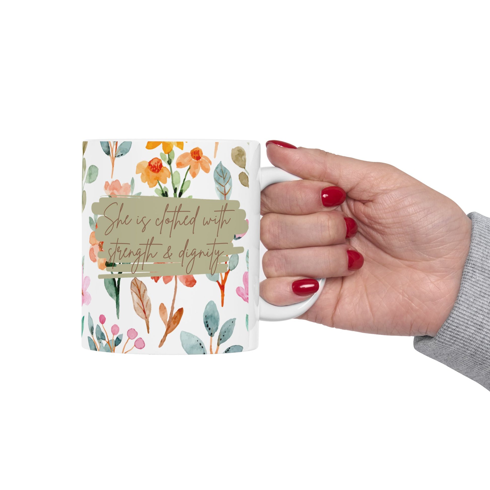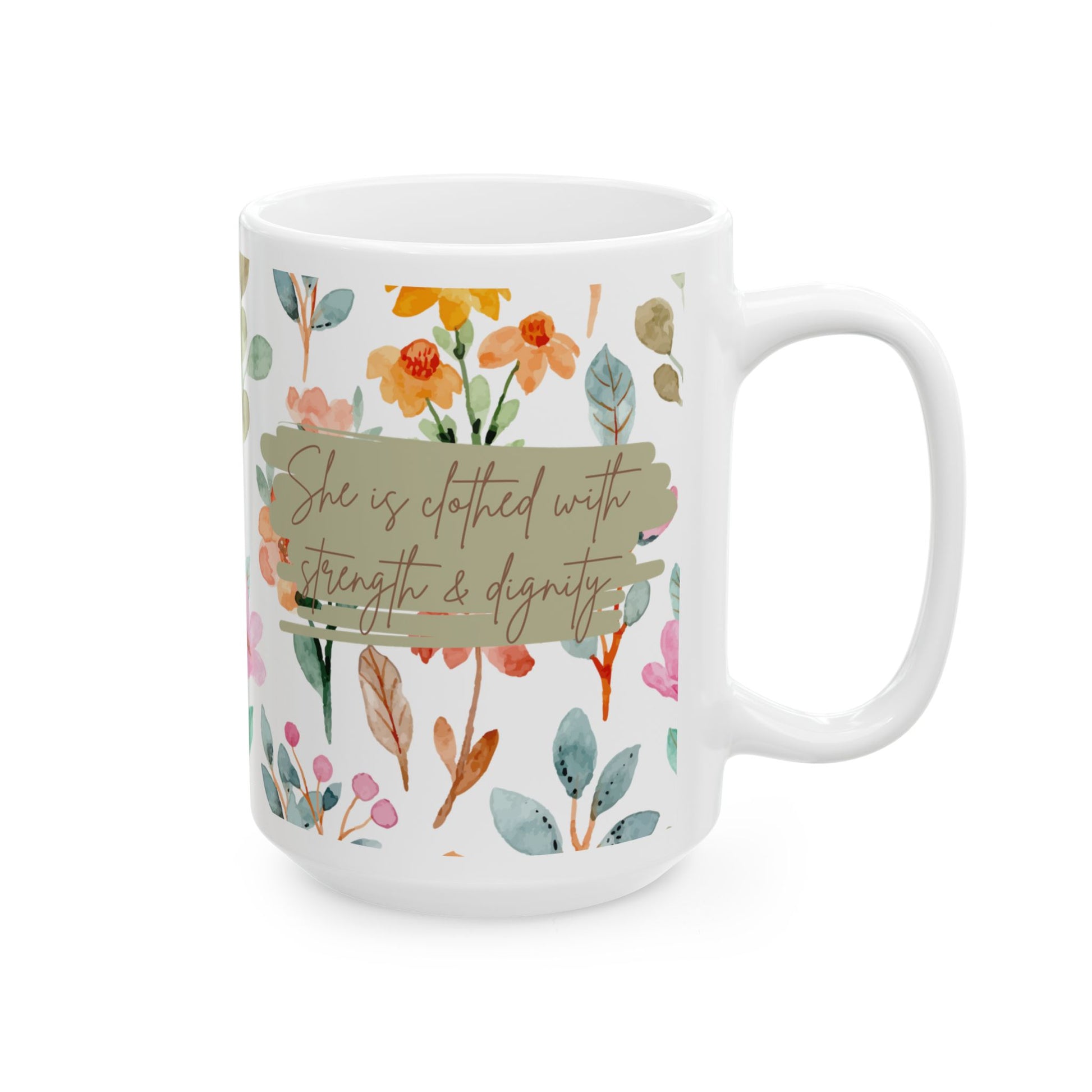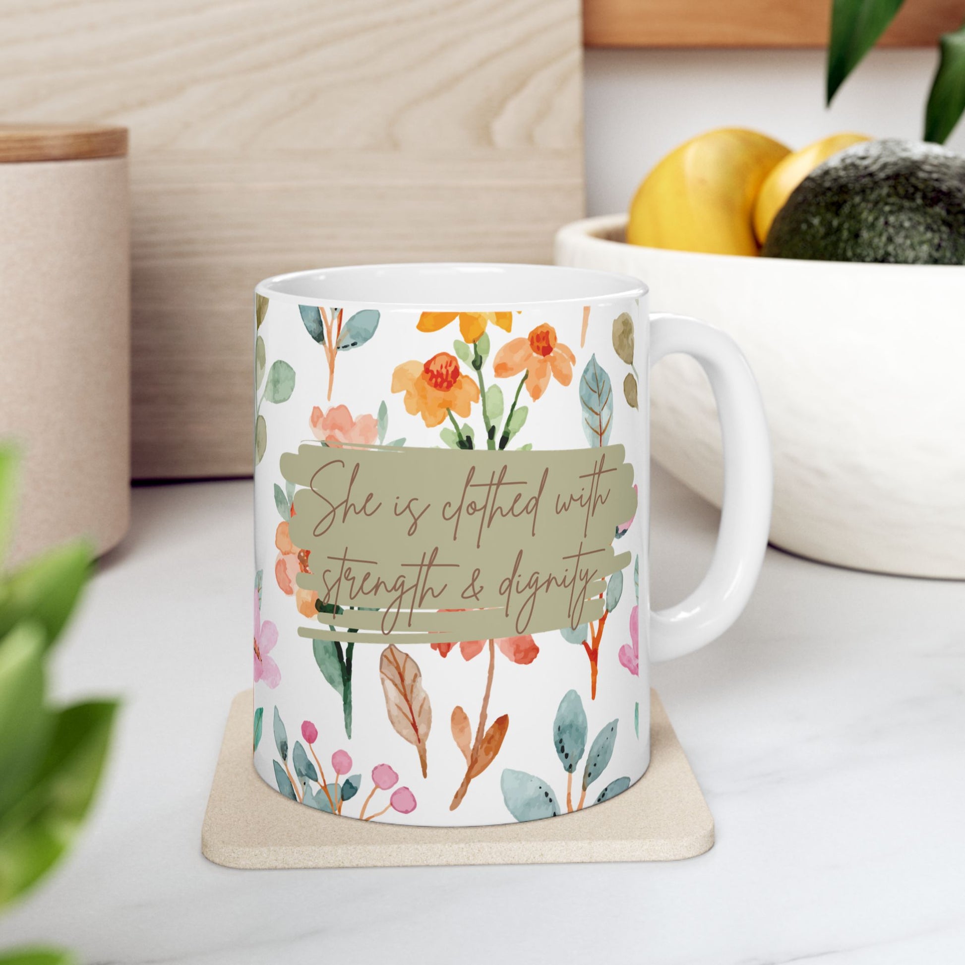 Floral Inspirational Ceramic Mug "She is Clothed with Strength & Dignity" - 11oz & 15oz